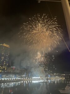 最後にダーリングハーバーで花火をするという情報を得たので、見に行きました。お勧め度としては、「時間に余裕があれば、、」くらいです笑 日本の花火の方が好きです。