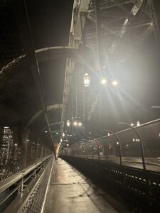 タロンガ動物園からサーキュラーキーに帰ってきた後、ハーバーブリッジを歩いて渡ることにしました。約1,149mあるそうです。写真のように所々に電気がついていて、橋の中央付近には警備員さんもいました。