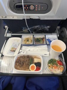 飛行機に乗った後、牛丼が出てきたのですが、かなり頑張って食べたのを覚えています。味は、おいしかったです。ハーゲンダッツも食べれました!